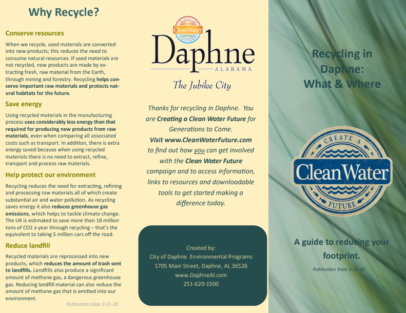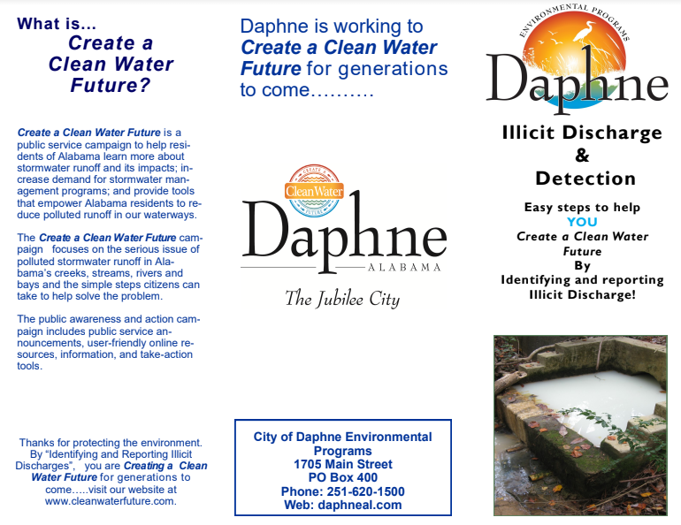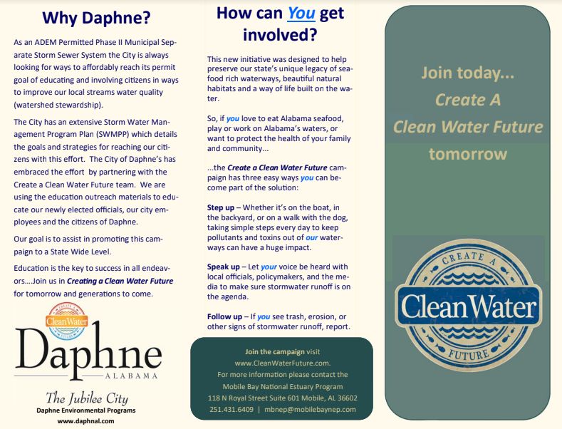 The Create a Clean Water Future campaign was developed to address limitations of local governments to fully adopt stormwater management programs and a need to help Alabama residents understand the link between reducing polluted runoff and the preservation of a unique way of life built on Alabama's waterways. The Create a Clean Water Future public service campaign is designed to explain what stormwater is and to encourage individual actions resulting in the reduction of stormwater pollution at both an individual and community level.