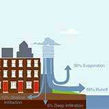 In some highly urbanized watersheds, as much as 55% of rainfall runs off an urban landscape that is covered by parking lots, roads, and buildings and only 15% of rainfall soaks into the ground. In comparison, a more natural landscape will infiltrate 45% of the rainfall with only 10% running off. The negative environmental impacts of an increase in stormwater runoff and subsequent peak instream flows in developed landscapes leads to increases in its delivery of pollutants such as nutrients, pathogens, metals, and sediment.